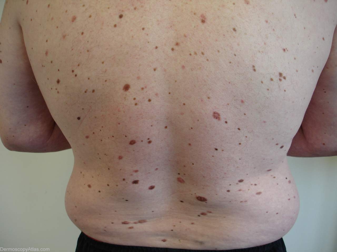 History: This man has multiple atypical nevi some of which when histologically examined have shown pathological features of dysplasia. He also has had a melanoma diagnosed 10 years ago but nil since. There are a variety of patterns seen in patients with dysplastic nevi and these are some of them.